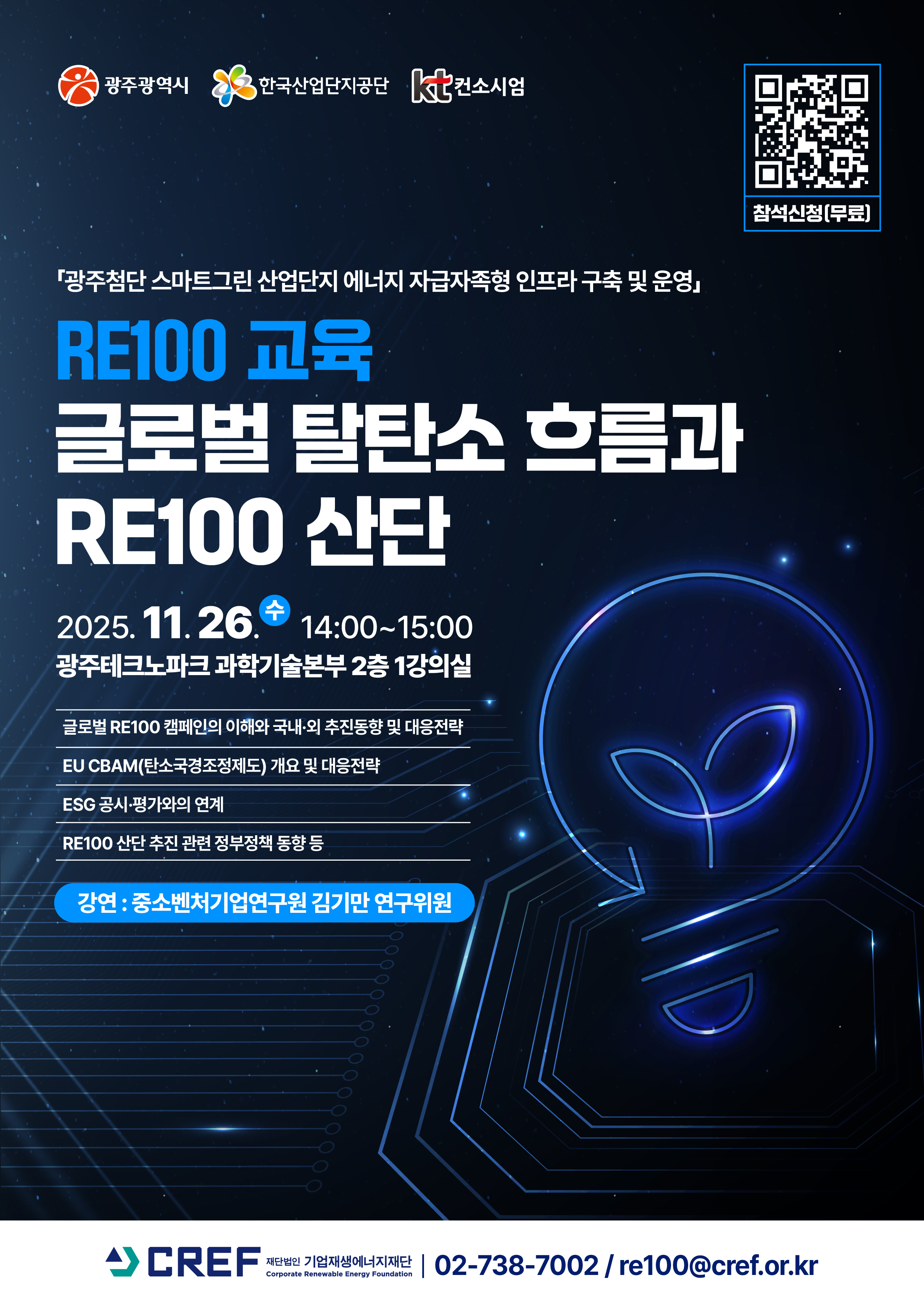 공지사항 뉴스 보도자료 자료실 공지사항 (광주) 글로벌 탈탄소 흐름과 RE100산단 교육 개최 작성일 : 2025-11-13 이전글 2026 재생에너지 경기동향 설문조사 참여 안내 목록 다음글 다음글이 없습니다.