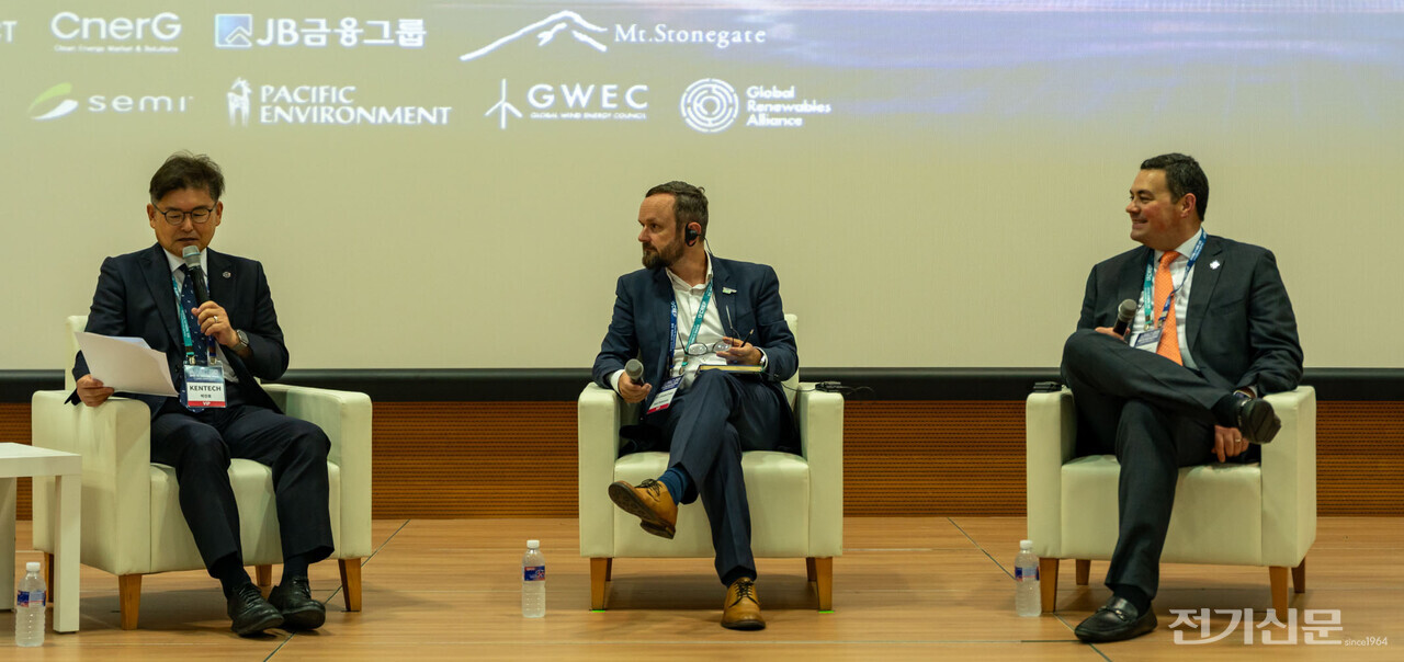 (왼쪽부터)박진우 한국에너지공과대학교 총장 직무대행 석좌교수, 샘 키민스 클라이밋그룹 에너지 담당 이사, 리치 파월 클린에너지바이어어소시에이션(CEBA) 대표가 대담을 나누고 있다. [사진=김진후 기자]